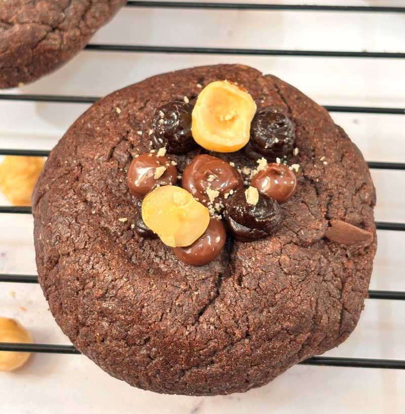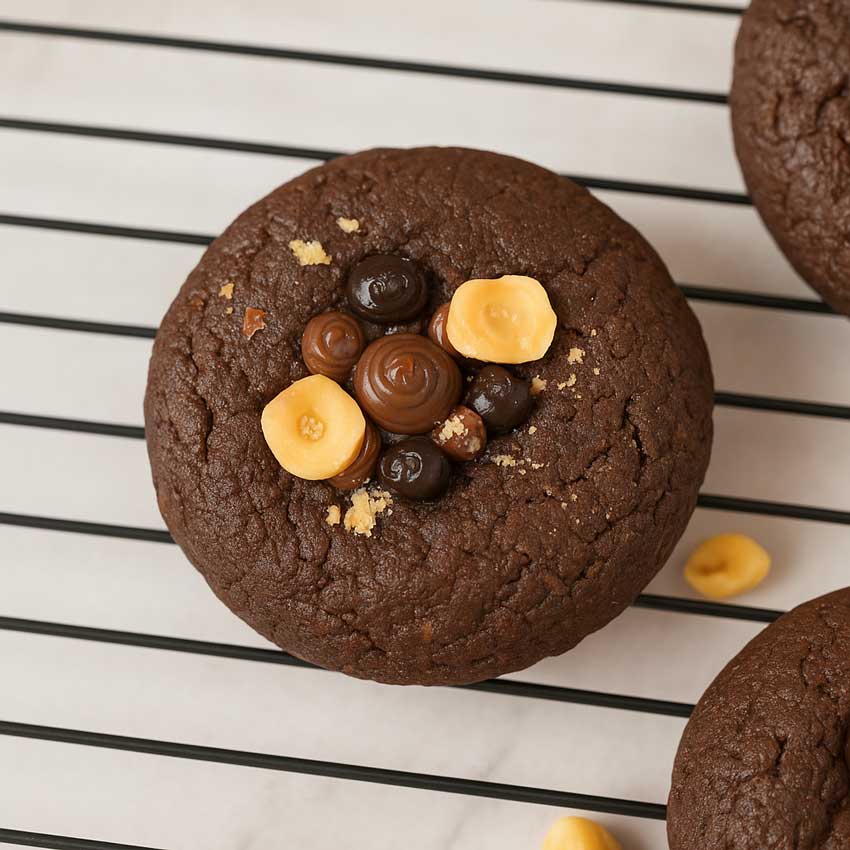 کوکی شکلاتی فندوقی با مغز نوتلا، تاپینگ نوتلا و گاناش شکلات تلخ، یک کوکی پرمغز و خوشعطر برای طرفداران طعمهای شکلاتی و فندقی. ترکیبی از شیرینی و تلخی ملایم در کنار بافت نرم و تاپینگ جذاب، مناسب خاصپسندان.